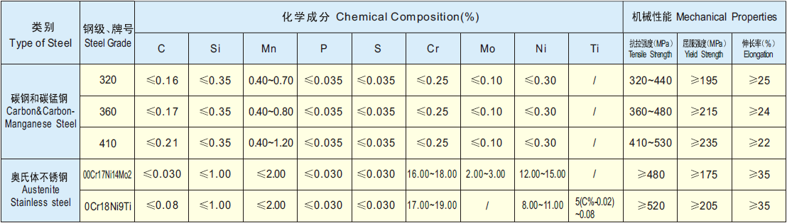 Main Steel Grades: 320 360 410 00Cr17Ni14Mo2, 09CrMoAl, 0Cr18Ni9Ti etc, Other grades can be supplied according to customers’ requirements